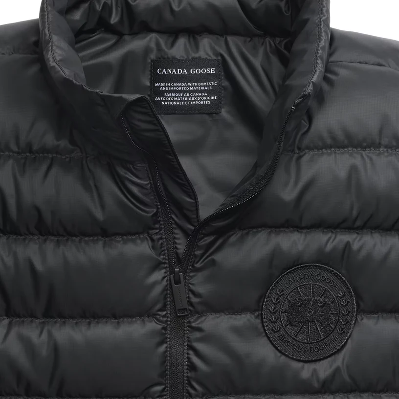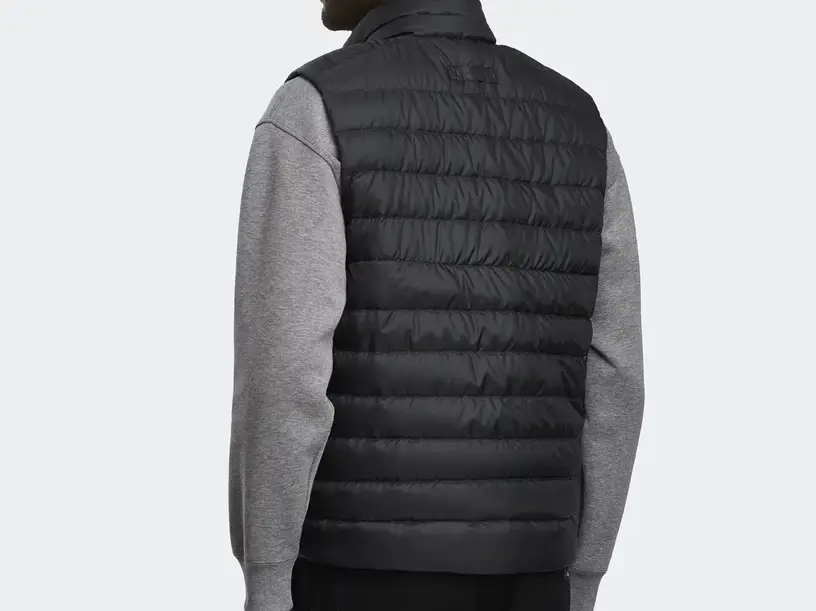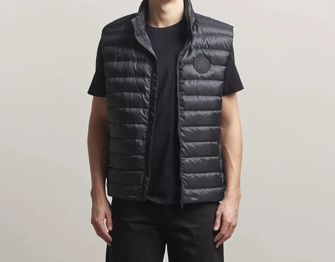 Visually, the Stratus Vest follows the brand’s minimalist aesthetic. The deep black colorway delivers a refined, adaptable look that pairs easily with denim, technical trousers, or tailored layers. Subtle branding—often through the recognizable Canada Goose Arctic Program patch or tonal detailing—ensures the vest remains identifiable without overwhelming the design.