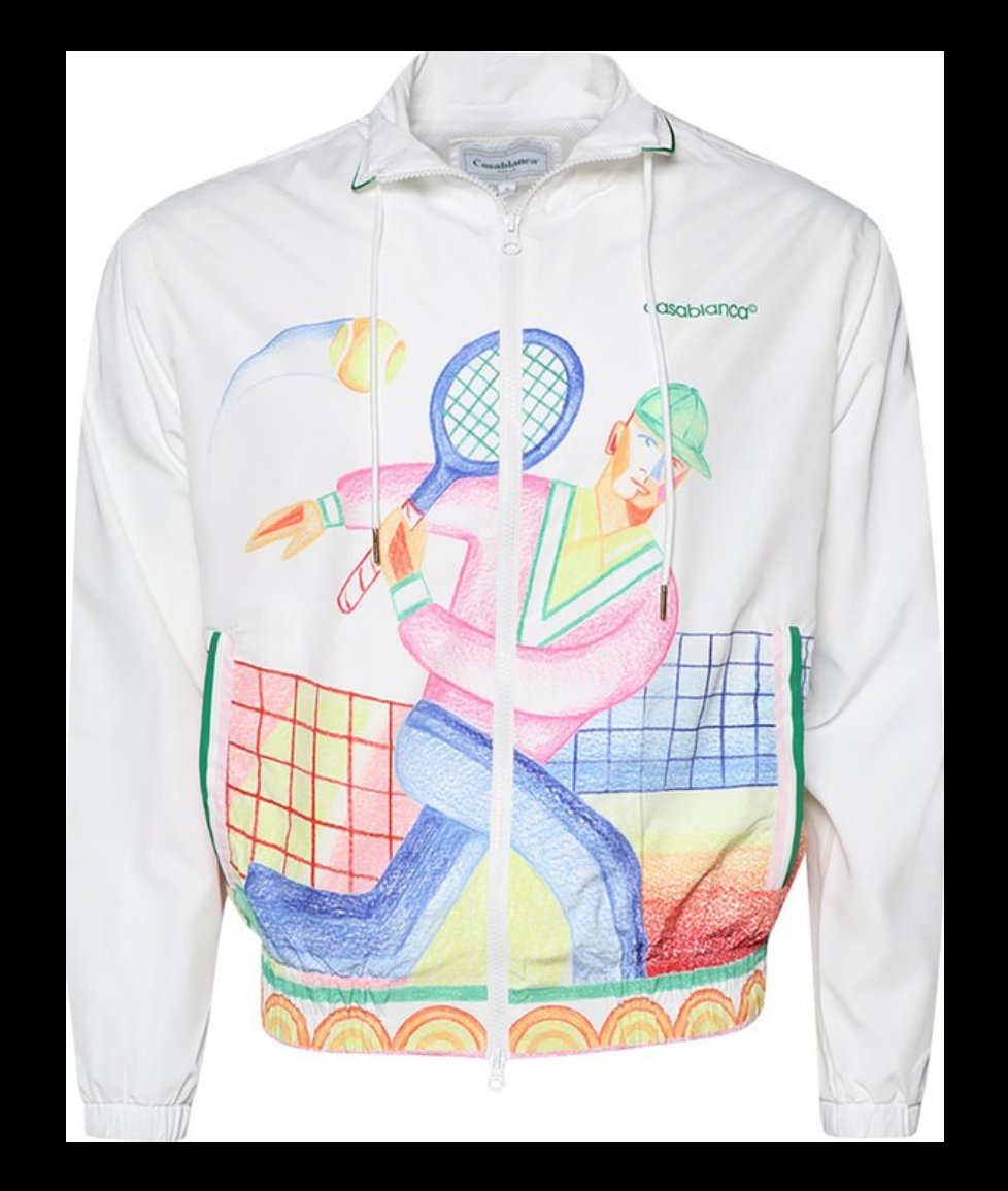 The ‘Crayon’ jacket is a standout piece from Casablanca’s collection, featuring a lively print that draws inspiration from childhood memories and artistic expression. The design is reminiscent of colorful crayon drawings, evoking a sense of nostalgia and playfulness. This artistic approach aligns with Casablanca’s tradition of incorporating cultural and personal elements into their designs.