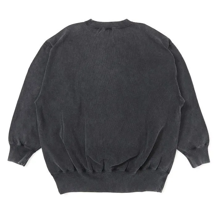 Cut in a relaxed, slightly voluminous silhouette, the sweatshirt drapes with ease while maintaining structure through thick ribbing at the hem, cuffs, and collar. That ribbed waistband gathers subtly, creating a rounded, almost ballooned body shape—an unmistakable silhouette often seen in Japanese streetwear, where proportion is everything. The material itself appears heavyweight, with a brushed interior that lends softness and warmth without sacrificing durability.