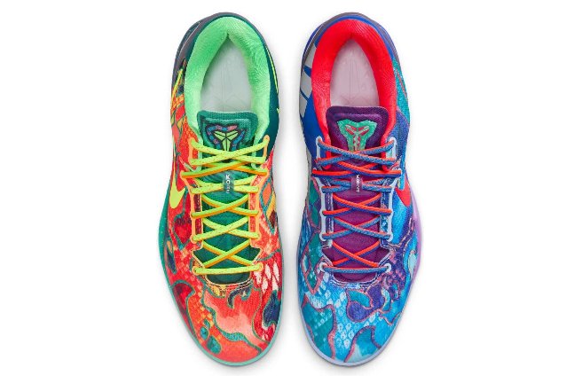 Though Nike hasn’t officially confirmed every source element that appears in the Protro 8 “What The,” early images and on-foot previews show a collage of references to some of the most iconic Kobe 8 colorways. Fans have already identified nods to:
