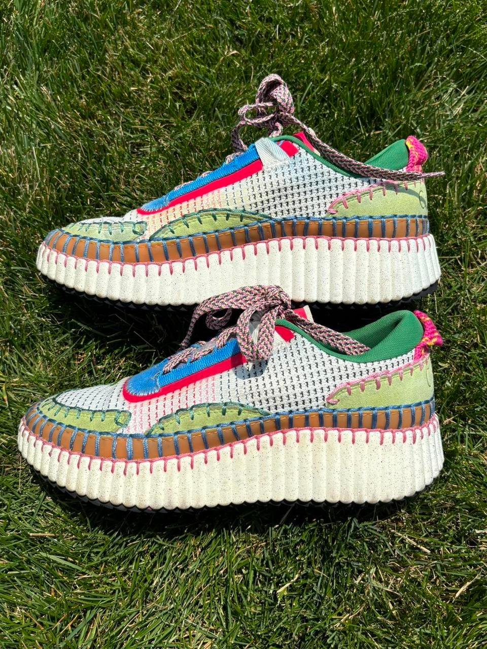 The sneakers are crafted from a combination of recycled mesh and calfskin, materials chosen for their reduced environmental footprint. This mix of materials also allows for a dynamic interplay of textures, giving the sneakers a unique and layered appearance. The hand-stitched detailing on the shoes highlights Chloé’s commitment to craftsmanship, a hallmark of the brand that has been carried into this modern, eco-conscious design. Each pair of Nama Sneakers is a testament to the meticulous attention to detail that Chloé is known for, blending traditional craftsmanship with contemporary design sensibilities.