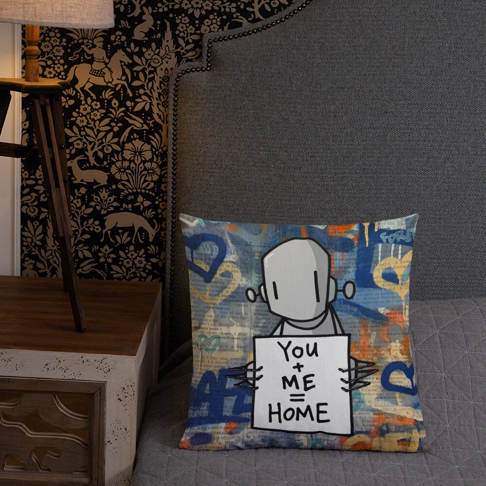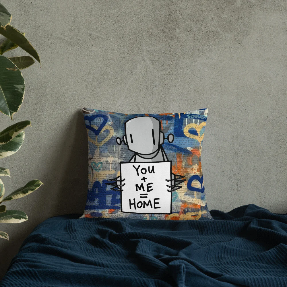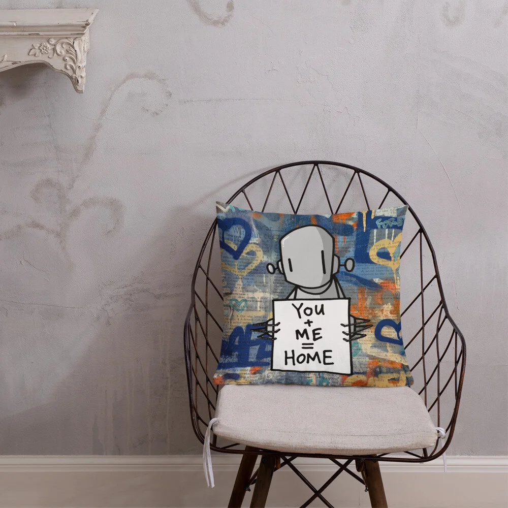 The pillow image features RWK’s familiar figure, a simple robot holding a sign that reads, “You + Me = Home.” The backdrop, layered with hearts, scrawls, and weathered text fragments, echoes the surface of a city wall—paint layered over remnants of older stories. The formula “you + me = home” captures RWK’s characteristic sentimental minimalism: part graffiti tag, part universal message of belonging.