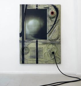 Sene composes the show not as a sequence of discrete works but as an orchestration of atmospheres. The layout reads like the inside of a game engine’s debug map: half theme park, half tactical interface. Sculptural paintings function like paused glitch-screens. Sound installation pulses with mechanical indifference.