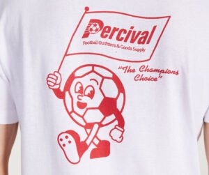 The standout? A Speed Greyhound T-Shirt in an oversized cut, emblazoned with a two-tone graphic print that reads like fictional university merch. The bold red and blue design on its reverse proclaims allegiance to the imagined “Percival Athletic Department,” a tongue-in-cheek creation that could easily pass for a real track and field club tee from 1977.
