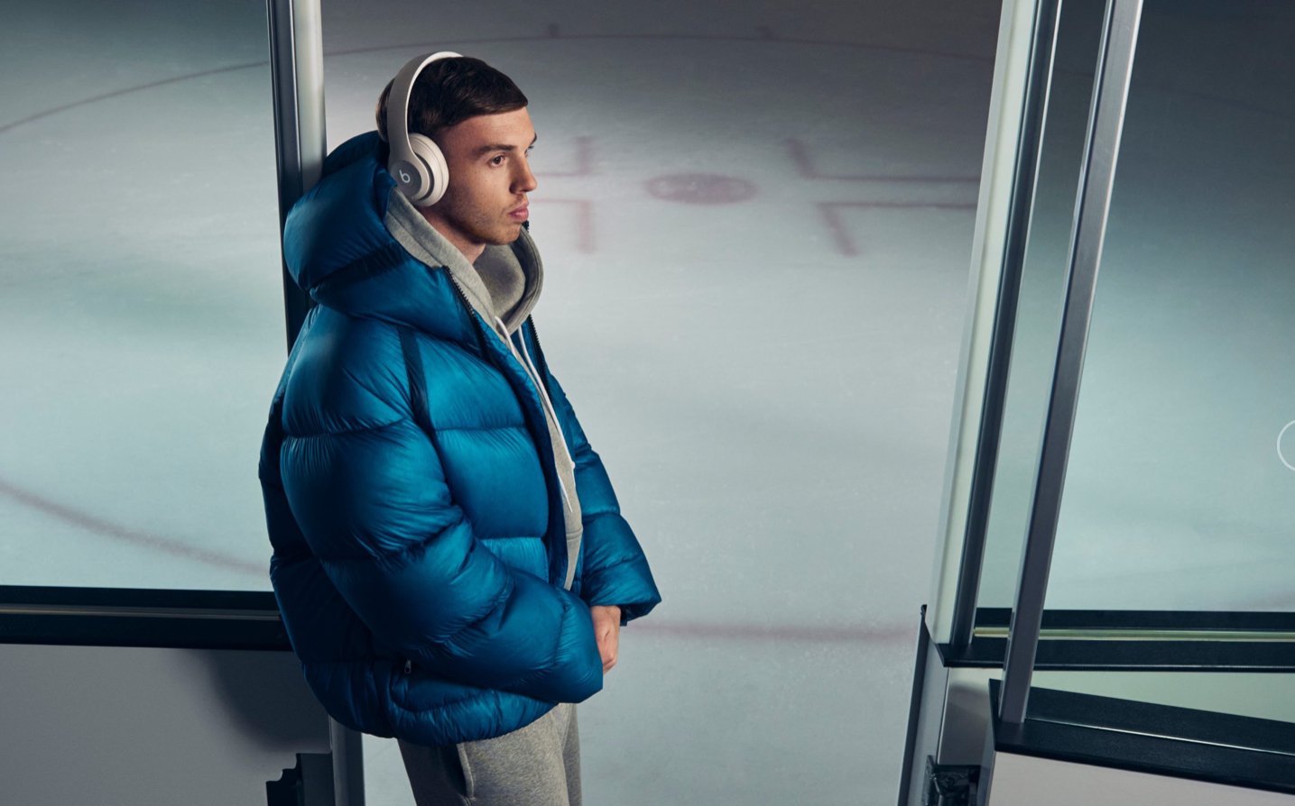 The short opens on an abandoned ice hockey rink: the air visibly crisp, the silence punctuated only by the scrape of skates. It’s there that Palmer emerges, not in kit but in a cobalt puffer, shoulders relaxed, Beats headphones firmly placed over his ears. He glides through the frost-covered venue with the same nonchalance he brings to Premier League penalties. There’s no puck, no goalposts—just Palmer, headphones, and the hum of control.