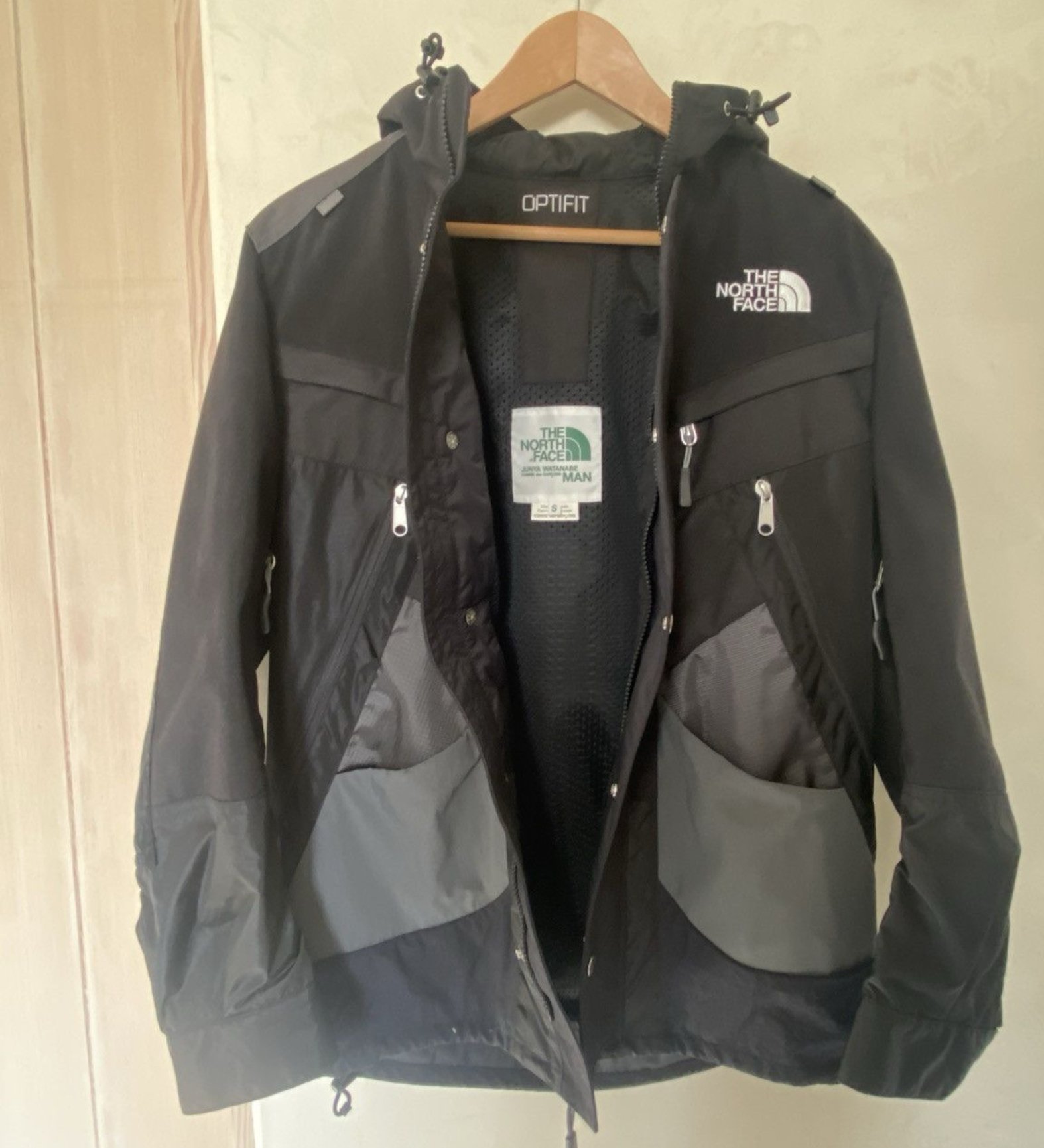 Logos from all three brands are integrated into the design in subtle yet noticeable ways, with The North Face’s iconic logo appearing on the chest and back, and Junya Watanabe’s brand subtly woven into the fabric patterns. Comme des Garçons’ influence is evident in the jacket’s unconventional silhouette and unexpected details like asymmetrical pockets and exposed seams.