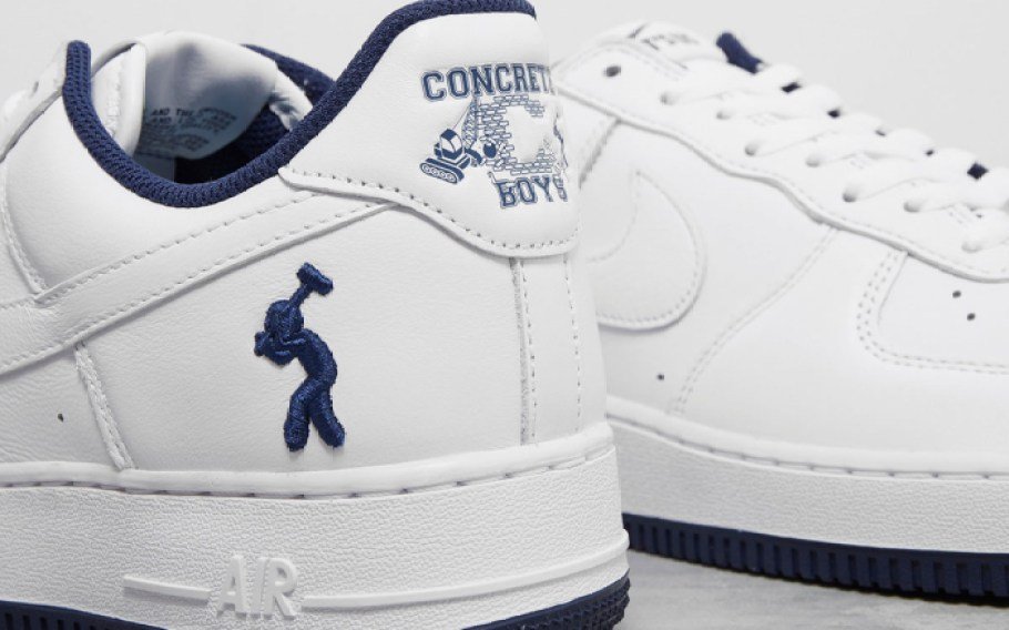 The “Concrete Boys” Nike Air Force 1 showcases these themes through its distinctive design. The classic white leather base is accentuated with deep navy blue touches on the sockliner and outsole, giving a nod to classic color schemes while ensuring the sneaker retains a unique edge.
