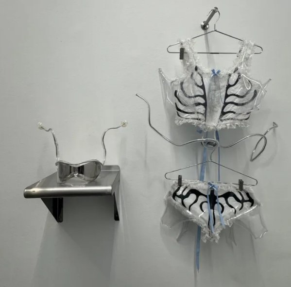 The gallery wall, once a neutral host of static declarations, now trembles with the charged presence of Lizzy Choi’s Ctenophora (2025), an anatomical rebuke to centuries of body discipline. Corset, briefs, and antennaed sunglasses—each component rendered in synthetic clarity and comb-like curvature—float in suspension, hung on wiry, quasi-organic armatures. If the white cube has long insisted on neutrality, Choi’s work pierces it with the bioluminescent pulse of embodiment, of protest, and of gendered transcendence. Named after the comb jellyfish, a marine animal renowned for its ethereal, ciliated glow, Ctenophora refracts identity through the aqueous logic of fluidity and resistance.