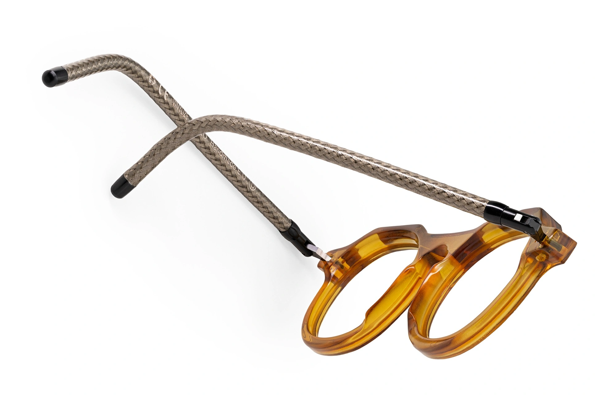 The cables are embedded into bio-acetate, a sustainable cellulose-based material that forms the foundation of the frame. The result is a unique texture: fine metallic filaments ripple across the acetate like veins of energy, creating a pattern that shifts subtly under light. No two frames are identical—each pair carries the memory of a different journey.