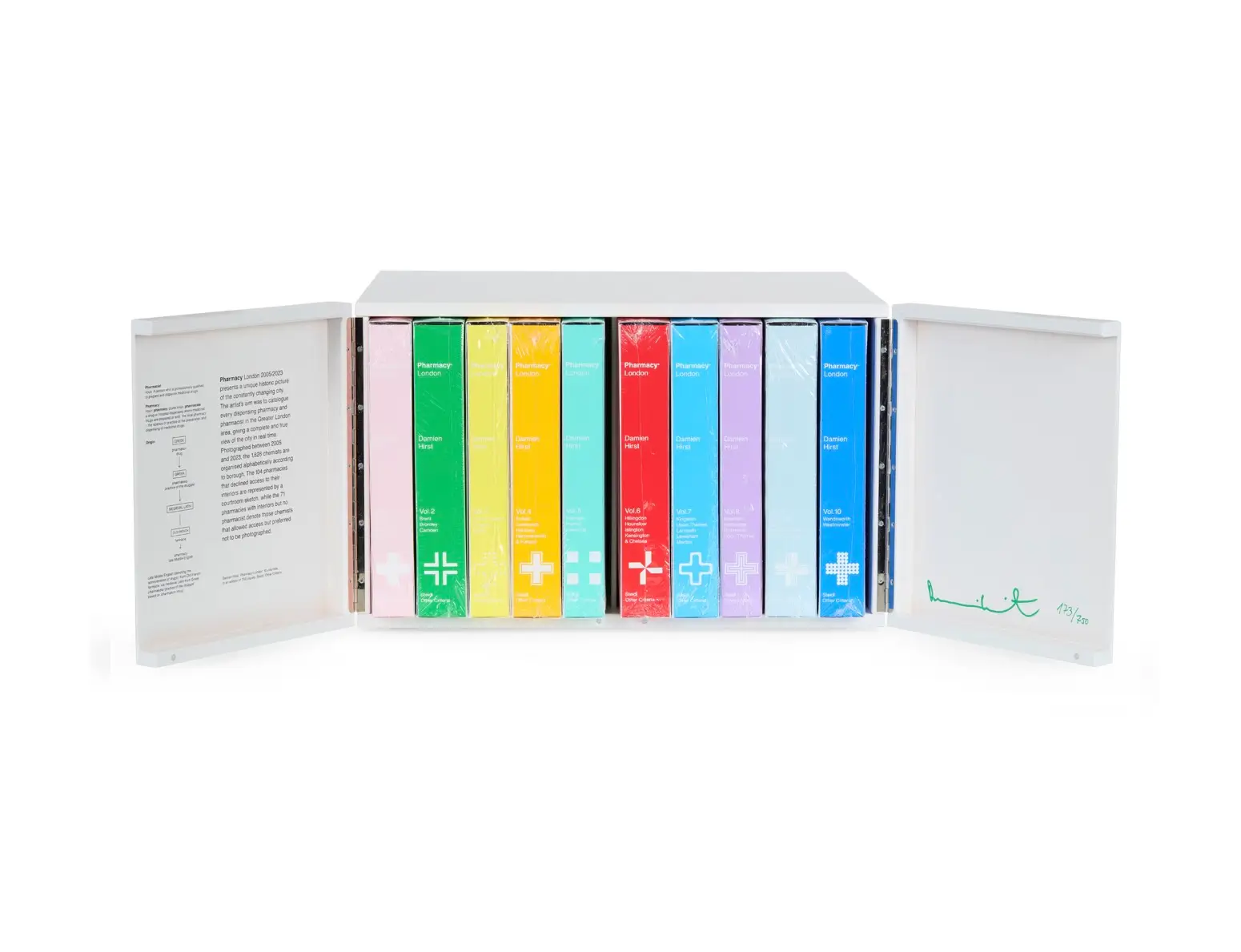 The boxed set, produced in 2000, exists as an extension of Hirst’s broader Pharmacy project—a conceptual ecosystem that spans installation, restaurant, prints, and sculptural works. It is not simply a collection of images; it is a compressed archive of a worldview. One where science, commerce, and faith converge under fluorescent light.