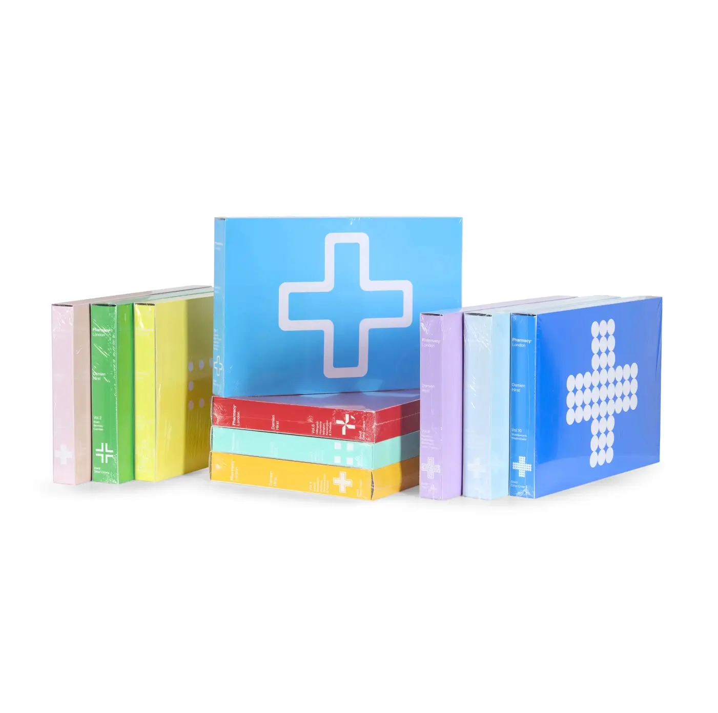 In Pharmacy, London (Boxed Set), packaging is elevated from functional design to conceptual content. Labels, logos, and color codes are not merely decorative—they are the artwork.