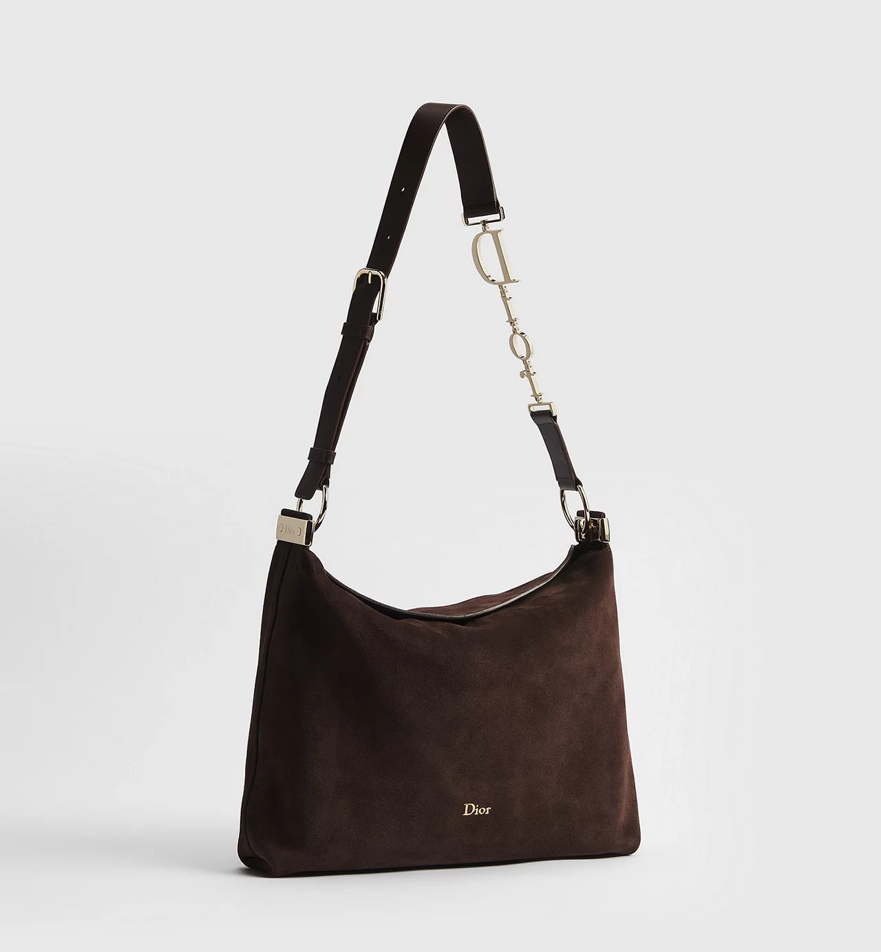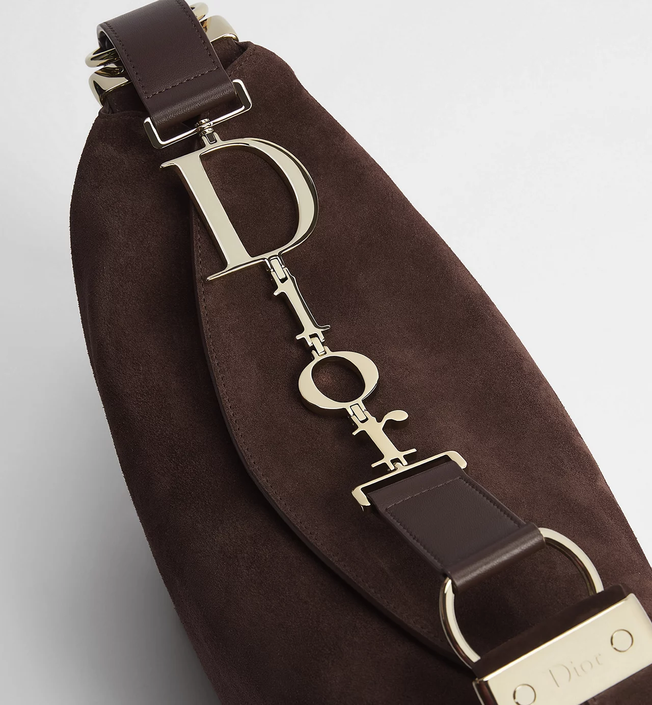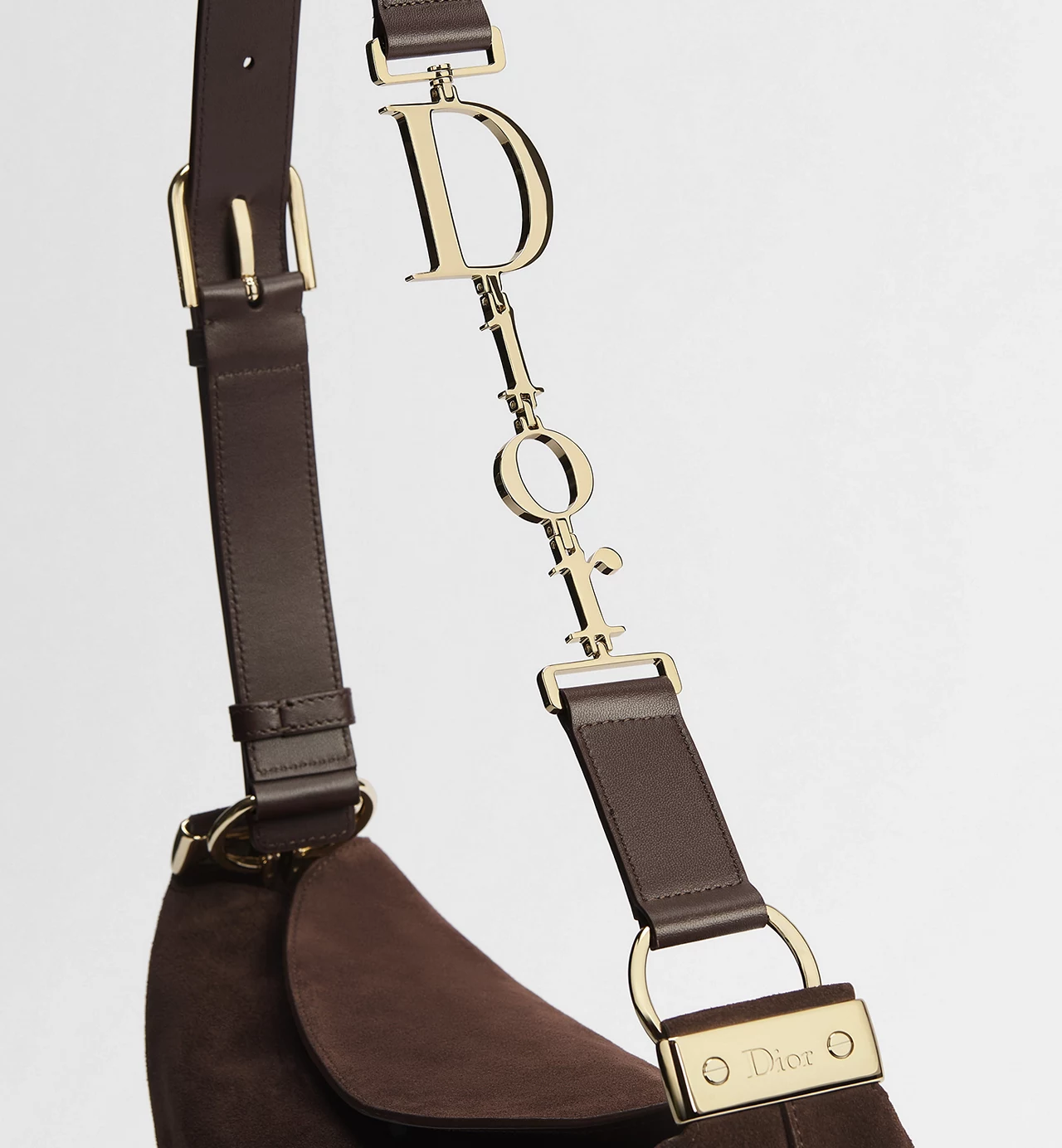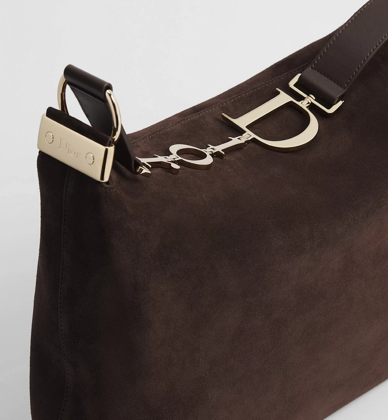 The metal Dior signature—placed along the strap rather than stamped across the body—functions less as branding and more as a point of articulation. It anchors the strap system, introducing a slight interruption in the otherwise continuous flow of leather. The hardware is polished, but not overly reflective; it catches light briefly, then recedes.