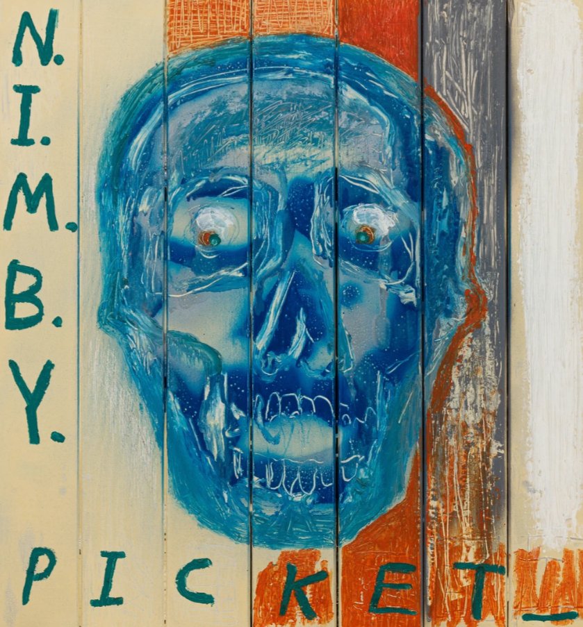 “Nimby Picket” is a prime example of this approach. The painting is an assemblage of vibrant hues, dynamic lines, and abstract shapes that converge in a layered, almost frenetic composition. The use of spray paint adds a gritty, urban quality to the piece, while the incorporation of non-traditional materials like metal scraps or cardboard lends it an industrial texture. This juxtaposition of bright colors and rough materials mirrors the tension between beauty and chaos inherent in urban environments. The title itself, “Nimby Picket,” references the acronym “NIMBY” (Not In My Backyard), which is often used to describe opposition to local development or change. This theme is subtly woven into the fabric of the painting, suggesting a critique of social and environmental hypocrisy—where people resist changes that inconvenience them while ignoring the broader impact of their own actions.