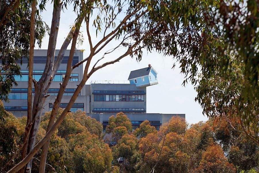 This abstract sculpture is a striking visual presence on the UC San Diego campus. The house appears as if it has been dropped from the sky and come to rest, somewhat miraculously, on the edge of Jacobs Hall, part of the UCSD Jacobs School of Engineering. The dissonance between the traditional, homey appearance of the house and its vertiginous location is immediately unsettling, and yet it is this very tension that gives the work its power.