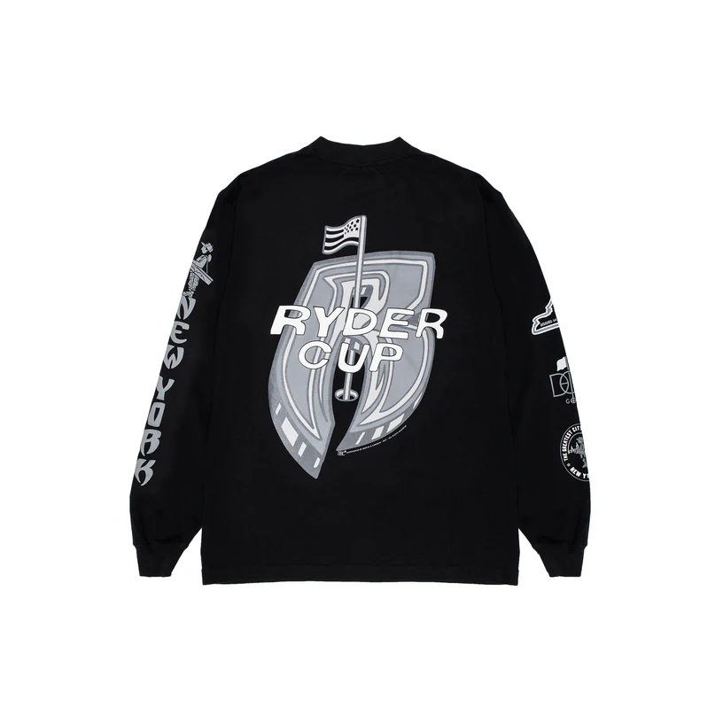 Large back prints have become a streetwear staple, drawing influence from skate decks, punk flyers, and tour merch. Here, the Ryder Cup crest is exaggerated to monumental scale, aligning with the ongoing preference for graphic-heavy apparel that doubles as a moving billboard.