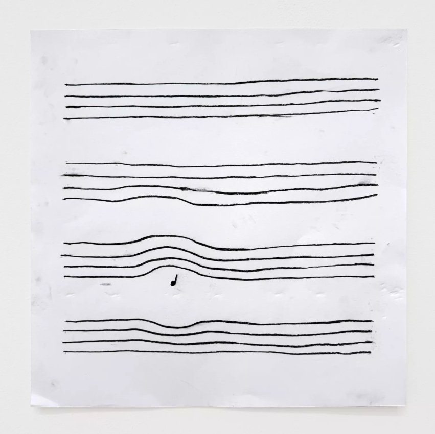 In “Untitled Ripple,” there are no clefs or tempo markings. Instead, the titular ripple flows across the paper like a waveform. But this isn’t a digital print. It isn’t plotted by software. It’s drawn—an analog echo made physical. The ripple suggests both disturbance and continuation, like the lingering effects of a sonic boom—or a cultural one.
