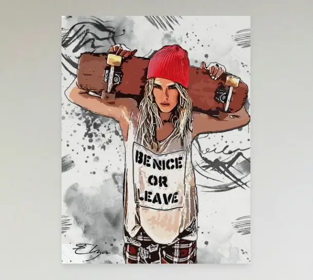 The first encounter with Gazelle Painting is not passive—it’s a confrontation. A young woman stares back, unflinching, her arms raised, a skateboard gripped behind her head like a weapon or a crown. There is no softness in the composition, no invitation to linger gently. This is a declaration: I see you, and I am not here to perform.