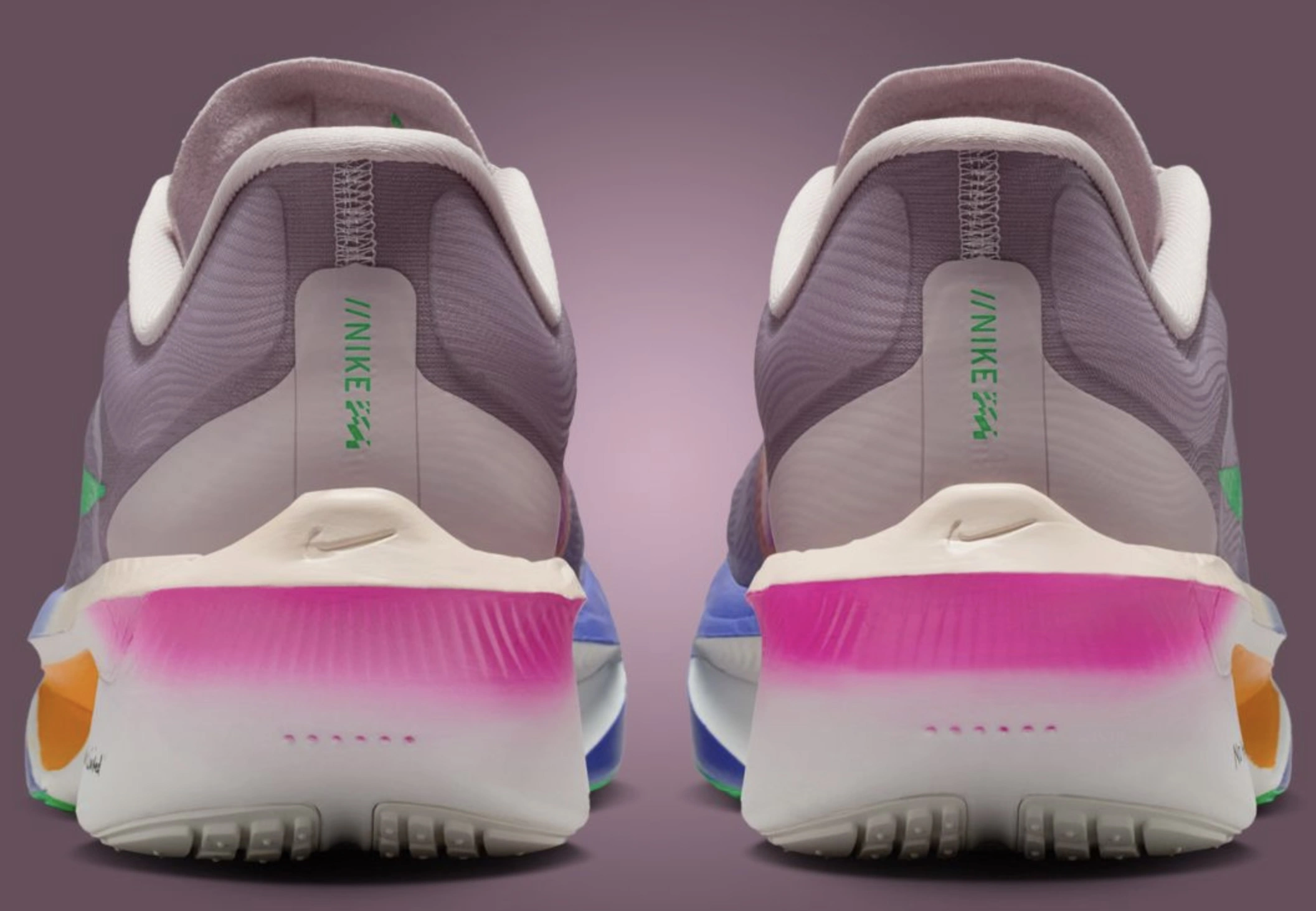 Rear view of the Nike Zoom Fly “No Human Is Limited” running shoes inspired by Eliud Kipchoge. The sneakers showcase a gradient pink heel fade transitioning into cream and purple tones, accented by a small embossed Nike Swoosh. Bright green “//NIKE ZOOM FLY” text runs vertically along the heel tabs, while hints of orange and blue from the midsole peek through the sides. The mauve background highlights the shoe’s aerodynamic structure and vibrant color layering.