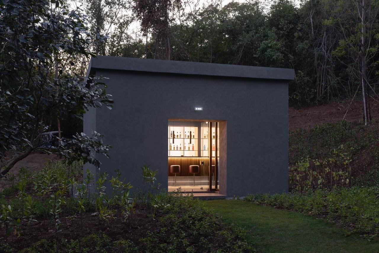 Located deep within Thailand’s Khao Yai Art Forest, K-BAR takes the form of an urban cocktail lounge transplanted into a lush, rural environment. Designed to mimic a high-end metropolitan bar, the structure is a sleek charcoal-gray pavilion that sits in stark contrast to its natural surroundings.