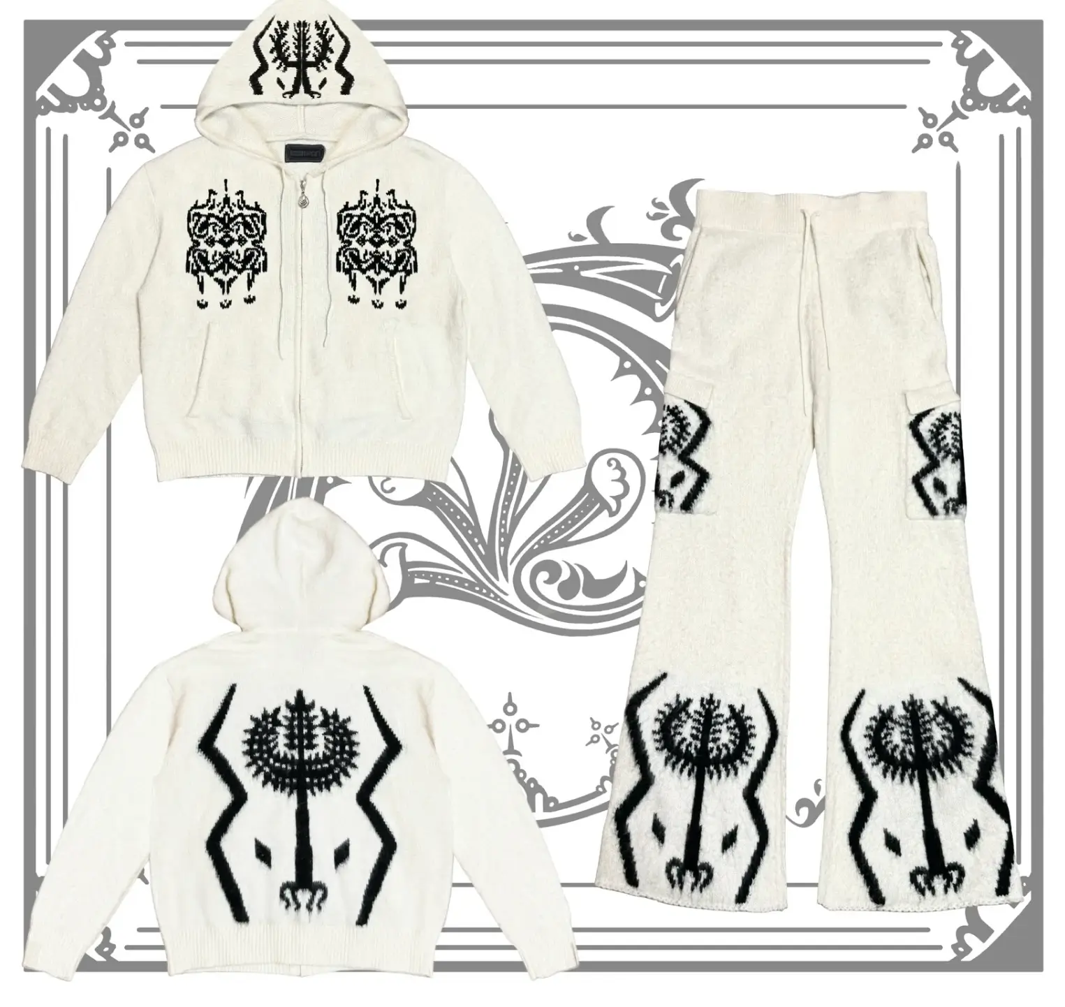 The bundle consists of a zip-up mohair hoodie and matching knit pants rendered in a soft off-white tone. Bold black Sacred Tree motifs appear across both pieces, creating a visual language that feels equally spiritual and futuristic. At first glance the set reads as streetwear, but closer inspection reveals a deeper design philosophy—one rooted in symbolism, craftsmanship, and identity.