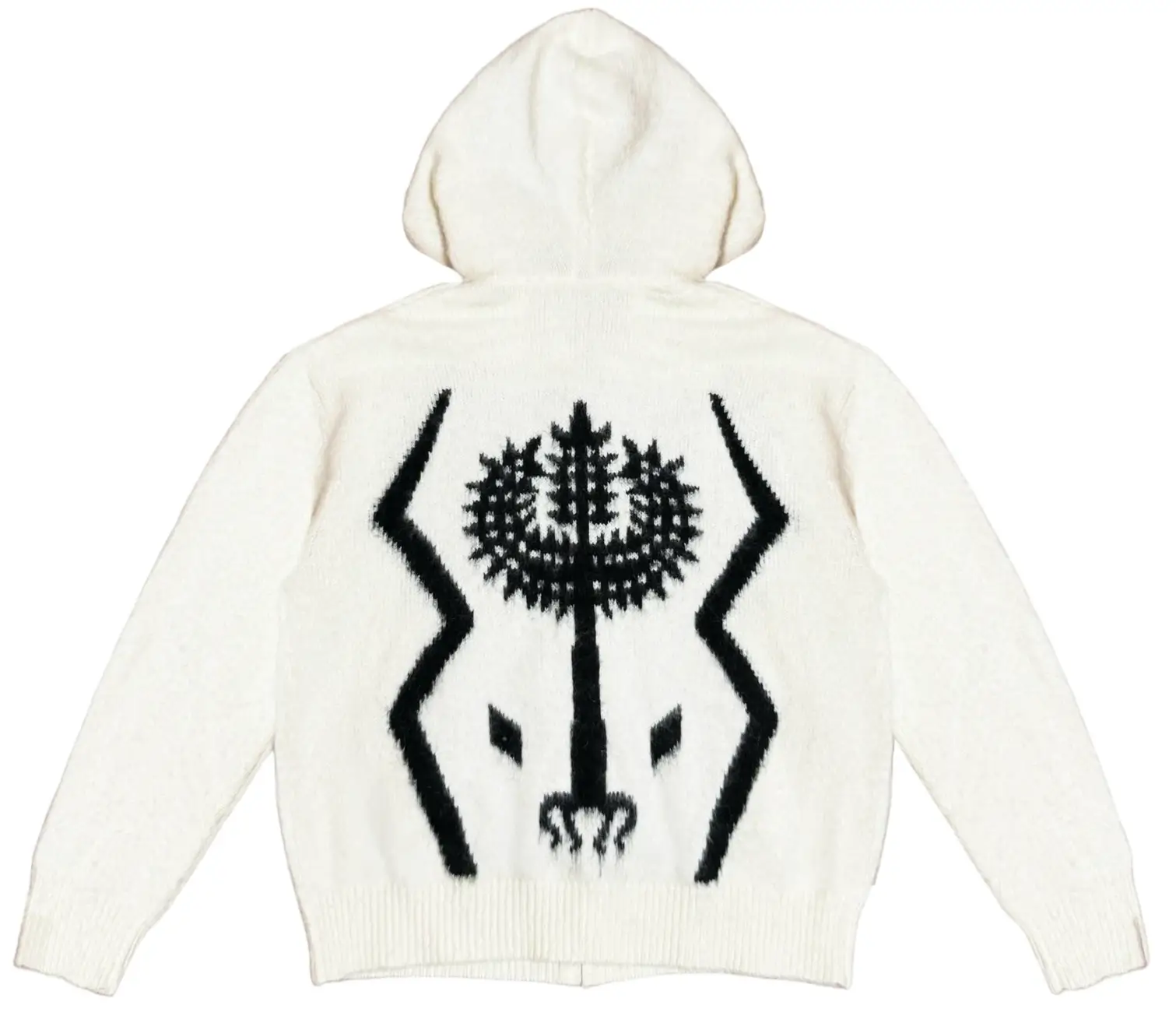 The Sacred Tree set uses mohair in a way that amplifies the visual experience. The slightly fuzzy texture softens the contrast between the black graphics and the white knit base, allowing the motifs to appear almost organic within the fabric.