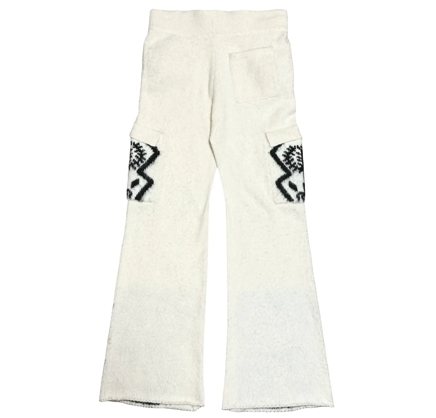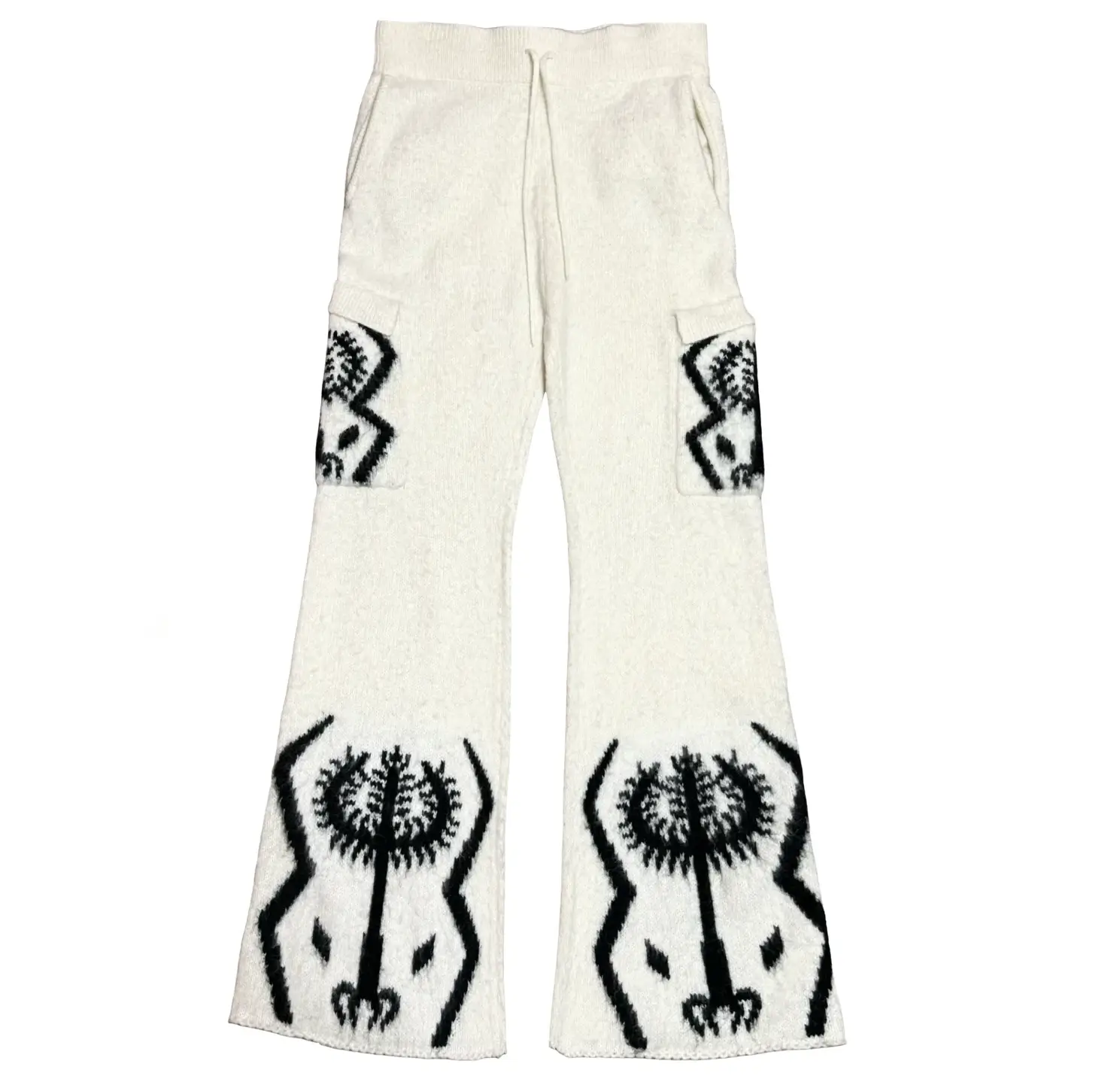 The pants feature a relaxed fit with a drawstring waistband, maintaining the comfort expected from knitwear. Cargo pockets on the sides add a functional element while also serving as additional canvases for graphic detailing.
