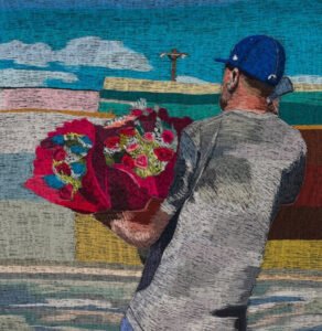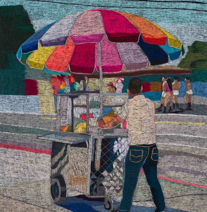 His work pays homage to the immigrant experience, weaving together moments of joy, struggle, and resilience that define life in his community. With an eye for the poetic in the mundane, Medel transforms fabric into a canvas of lived experiences, using each stitch to bring his memories and observations to life.