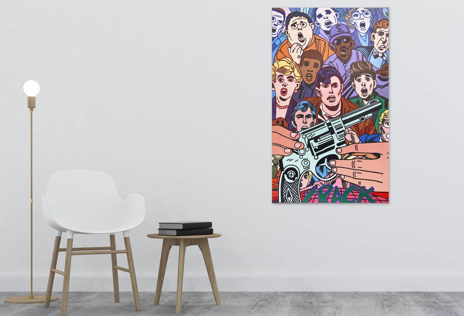 The painting’s fragmented composition, use of vibrant colors, and juxtaposition of pop culture and political imagery serve as a timeless commentary on the relationship between entertainment, media, and global conflict. In doing so, The Gunremains a relevant piece in today’s world, where issues of militarization, consumerism, and violence continue to shape our global society.