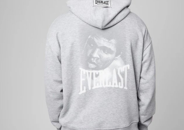 Functional details further anchor the hoodie in its athletic lineage: a spacious kangaroo pocket, ribbed cuffs and hem for shape retention, and a double-layered hood lined in contrasting color. A woven patch on the sleeve features both EVERLAST’s boxing crest and Ali’s autograph—a subtle but potent convergence of legacy and brand.