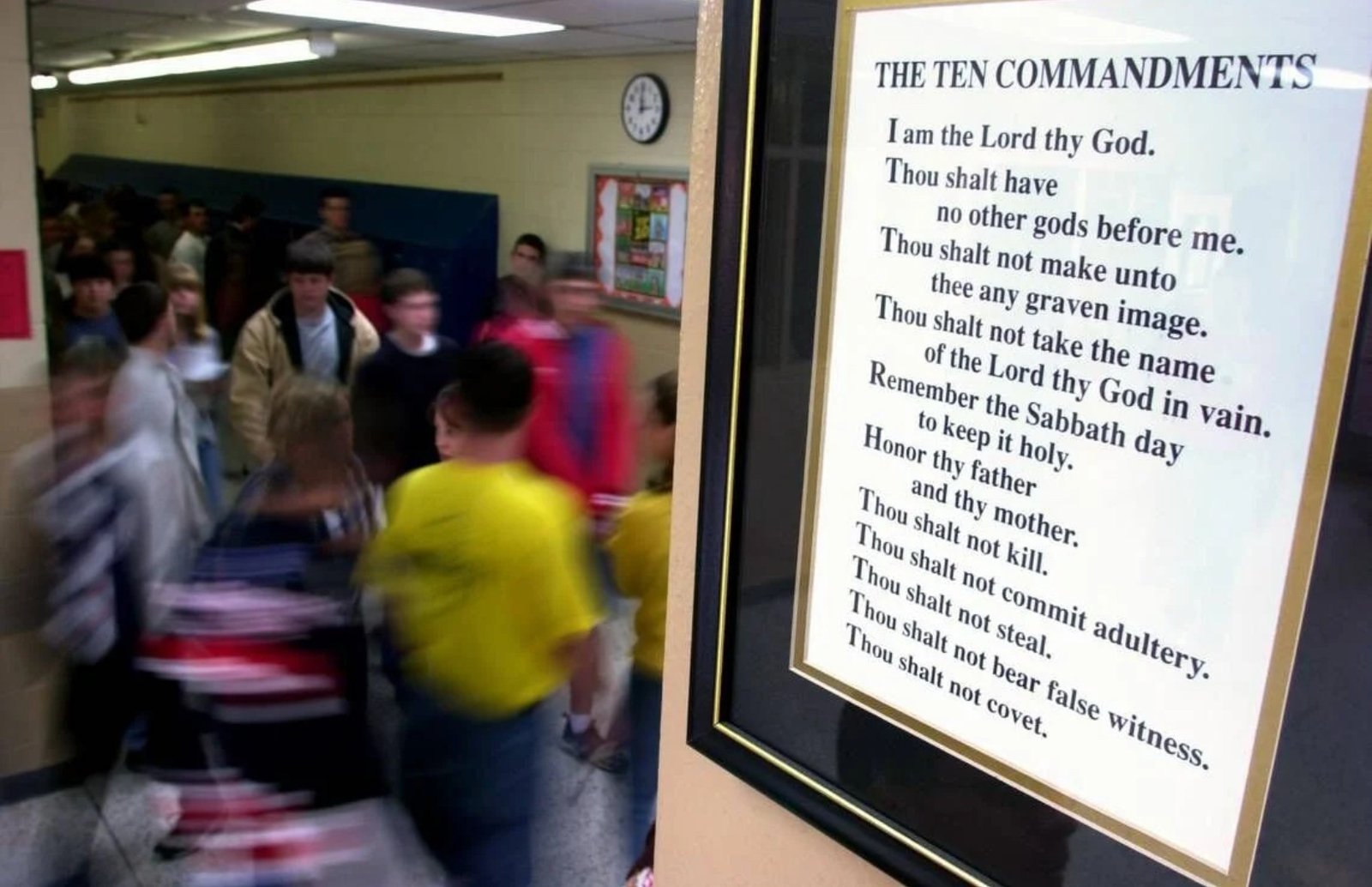 The Texas law mandates that all public K–12 classrooms must display a framed poster of the Ten Commandments at least 16 inches wide and 20 inches tall, with text large enough to be legible from across the room. The law specifies the version of the commandments to be used—an ecumenical translation that attempts to unify Protestant, Catholic, and Jewish variations but inevitably fails to satisfy all.
