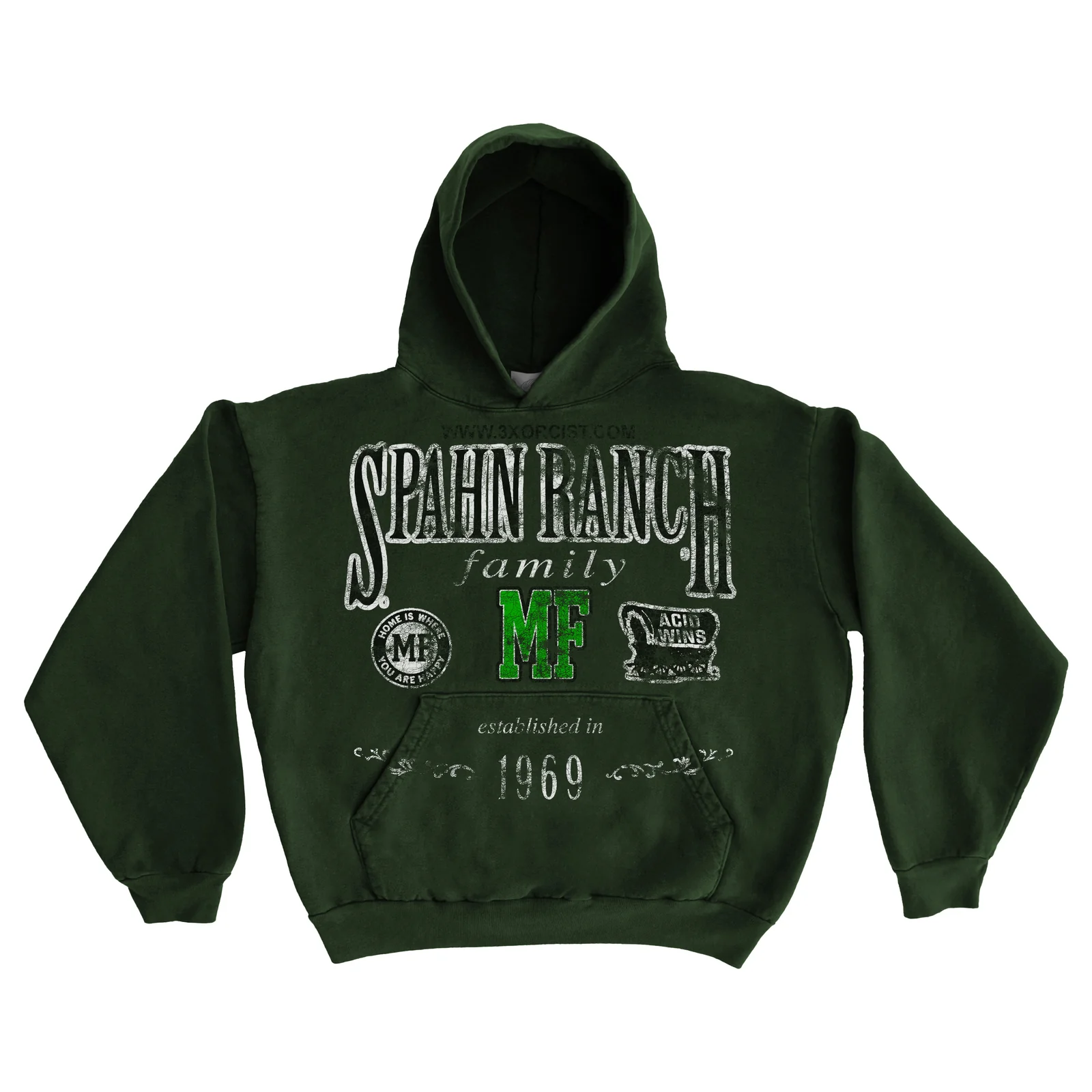 The Spahn Ranch Hoodie by Farmer’s Daughter does not operate as a neutral article of clothing. It reads instead as a condition—an atmosphere constructed through fabric, typography, and reference. Under the Exorcistby imprint, the piece distances itself from straightforward branding and moves toward something more interpretive, where meaning is suggested rather than declared.