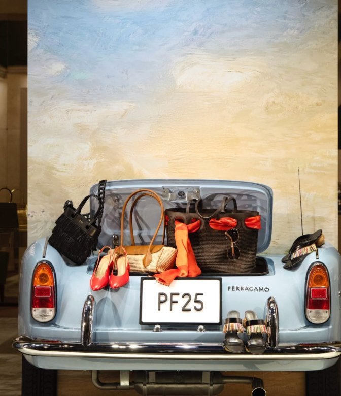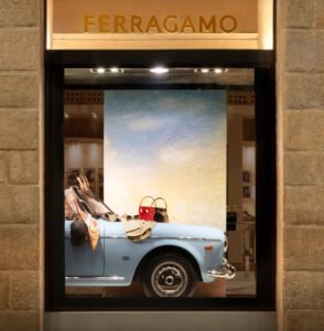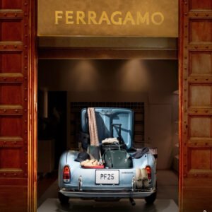 In the dimming light of Florence’s golden hour, a boutique on Via de’ Tornabuoni illuminates with an unusual reverie: a car not made for driving, but for dreaming. The Ferragamo PF25 installation — a cinematic and sculptural display crafted in honor of the Pre-Fall 2025 collection — pulls fashion’s gaze from the runway and parks it into a movie scene reborn. Through six curated windows, Salvatore Ferragamo retells the golden age of Italian cinema — not by resurrecting Fellini or Loren, but by filling the trunk of a handcrafted roadster with handbags, silk scarves, suede loafers, and echoes of La Dolce Vita.