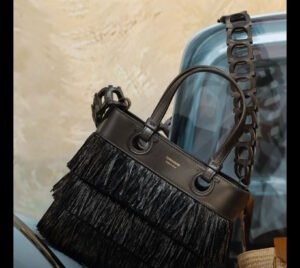 - The black fringe tote, textured in sharp cascading tiers, glistens under directional lighting that mimics late-day sunlight on a Cinecittà backlot.