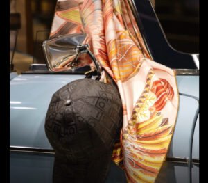 The accessories do not sit in the car — they perform. They recline, drape, lounge like divas in repose. A tan straw tote leans against the rear fender, anchored by a leather belt and half-tied scarf. Nearby, a pair of men’s driving shoes in velvet midnight suede nestles in shadow under the antenna. Even the car mirror is adorned with a billowing silk foulard in orange and ochre — a pattern reminiscent of 1960s wallpaper in Capri villas, fluttering as if caught by a fictional breeze.