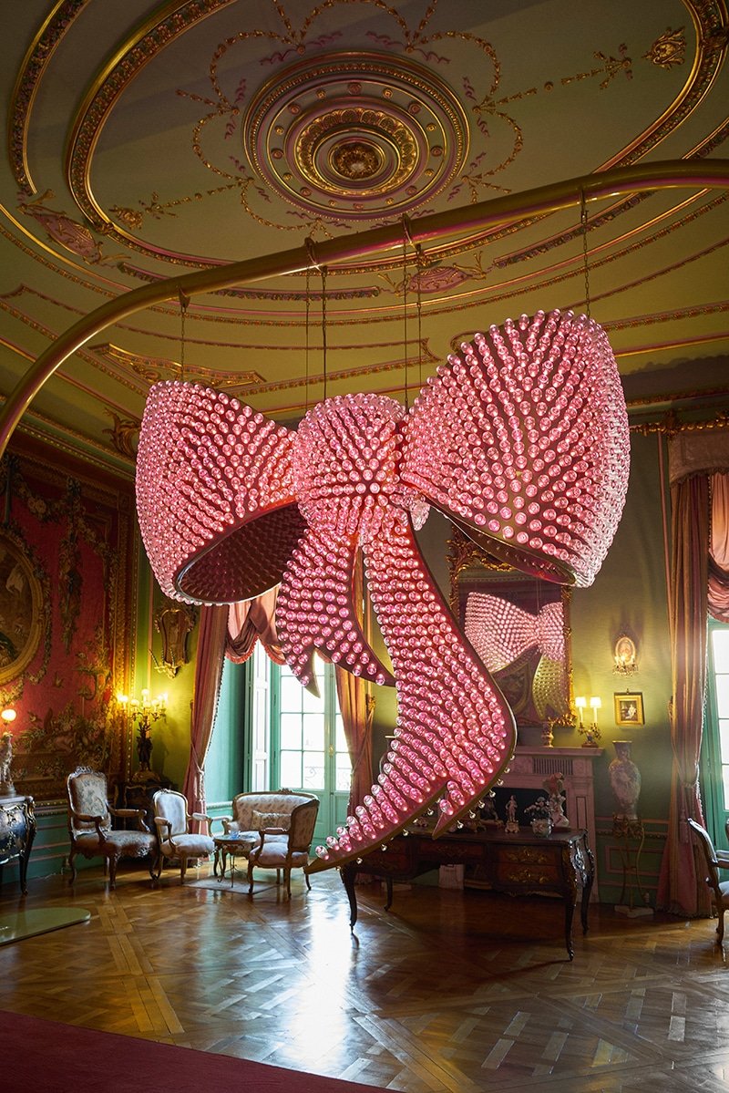 The exhibition features a selection of Vasconcelos’ most iconic works, reimagined to interact with the palace’s unique architecture and historical artifacts. Among the highlights is “The Bride,” a monumental chandelier crafted from thousands of tampons, which hangs majestically in the grand ballroom. This piece, both provocative and elegant, exemplifies Vasconcelos’ ability to blend humor with social commentary.