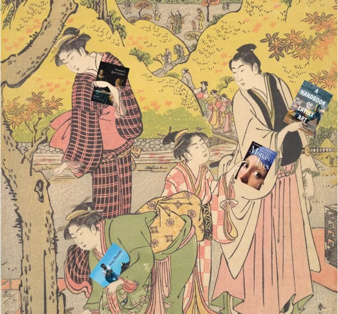 The caption is playful: “Even the figures in Katsukawa Shunchō’s 1789 woodblock print only buy from independent bookstores.” It’s paired with an image that’s over two centuries old—figures in elaborate robes browsing a shopfront scene, rendered in delicate lines and colors, with all the grace typical of the ukiyo-e tradition. The joke, of course, is modern—a wink to today’s pushback against Amazon’s cultural monopolies and a celebration of small bookstores as sanctuaries for the thoughtful.