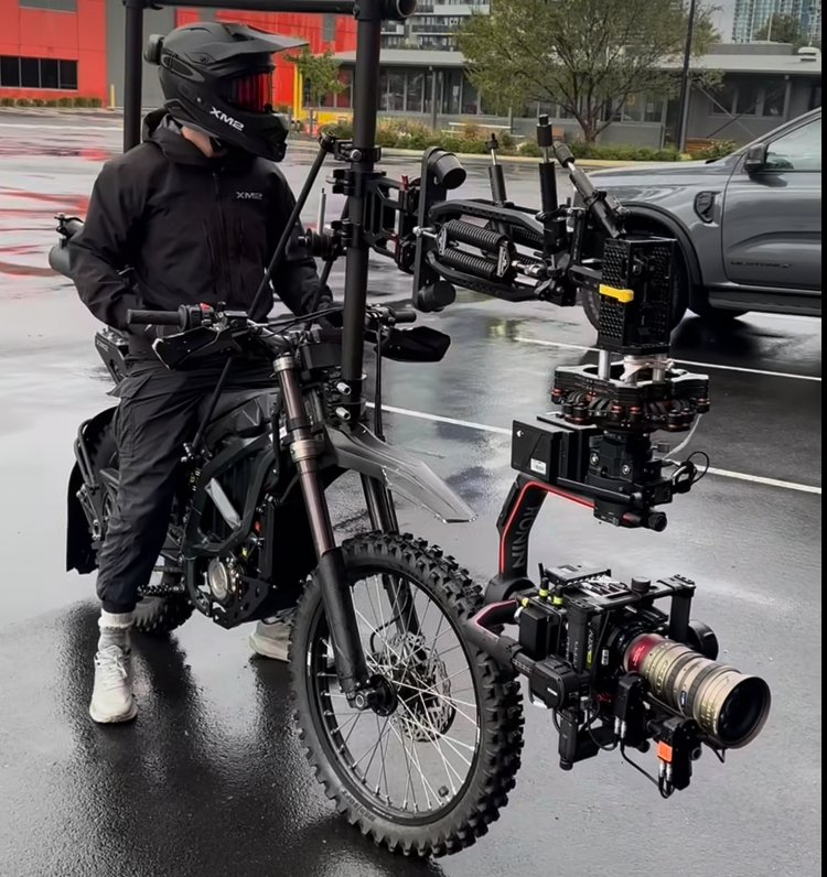 This brings us to the image provided: L.T. astride a high-performance electric dirt bike, outfitted with an XM2 Labs motion gimbal system. This isn’t a novelty—it’s a working rig used for car chases, action sequences, and high-speed tracking shots in top-tier productions.