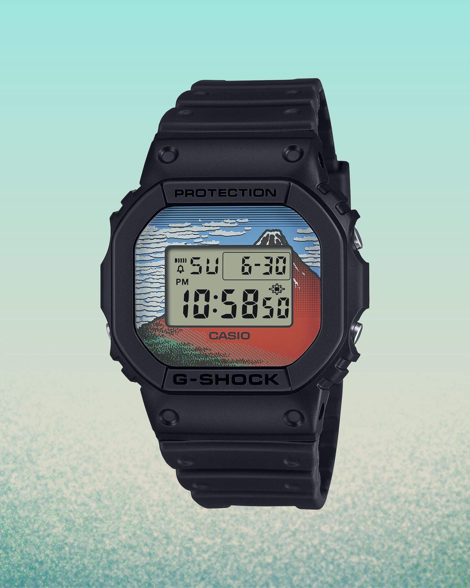 Known for its minimalist beauty, “Fine Wind, Clear Morning” showcases Mount Fuji under a clear red sky. The DW-5600 reimagines this tranquil scene with warm tones and clean lines, reflecting the simplicity and harmony of the original print. The watch’s design captures the essence of Hokusai’s work while maintaining G-Shock’s tough, utilitarian aesthetic.
