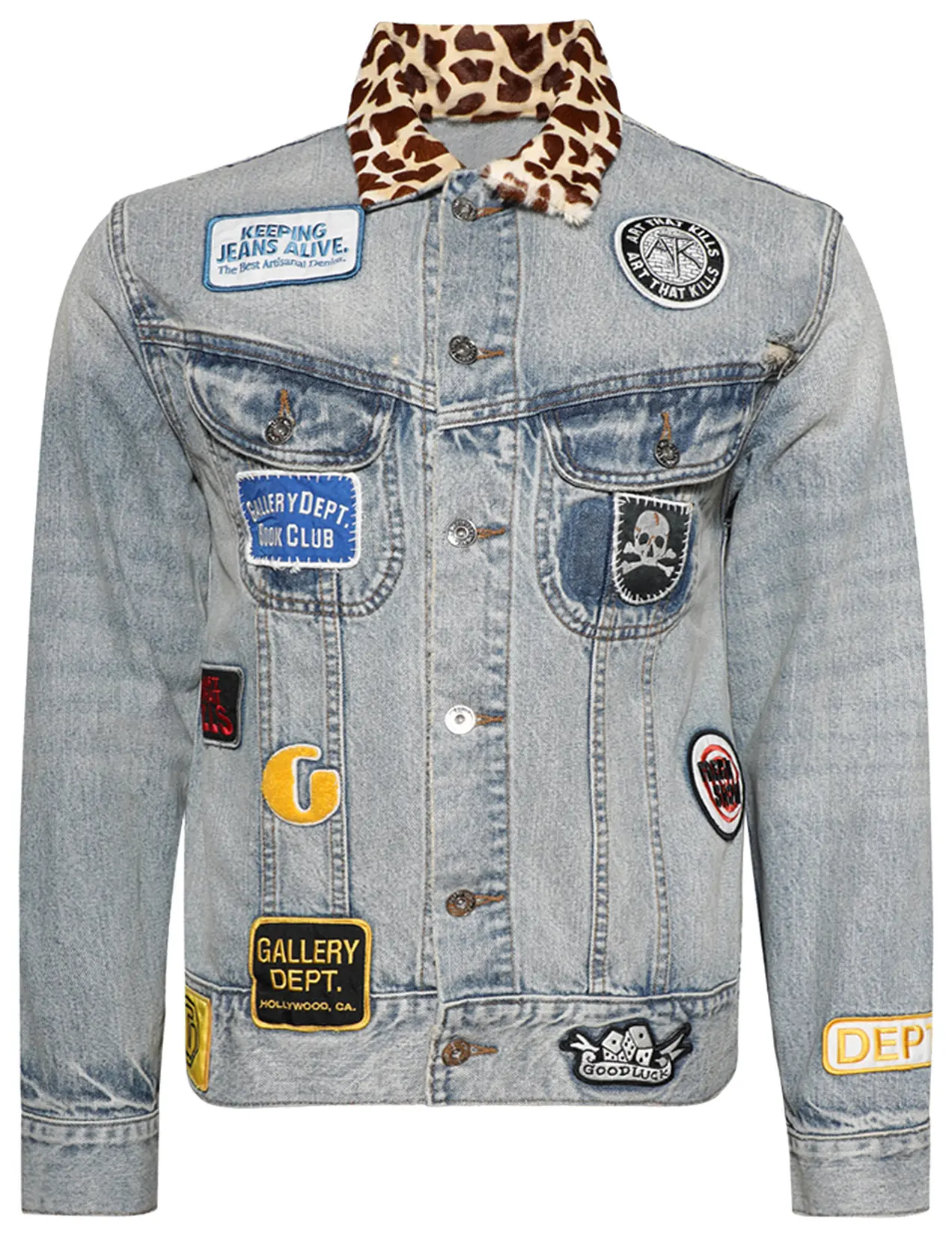 Its silhouette references classic 1990s trucker jackets but with subtle exaggerations. The shoulders are slightly broader, the hem a bit cropped, giving it a streetwise proportion that pairs equally well with raw denim or oversized sweats. The chest features utility-style pockets with branded brass snaps, while the back panel displays the GALLERY DEPT. logo in distressed screen print—a signature motif that has become symbolic of the brand’s guerrilla approach to fashion.