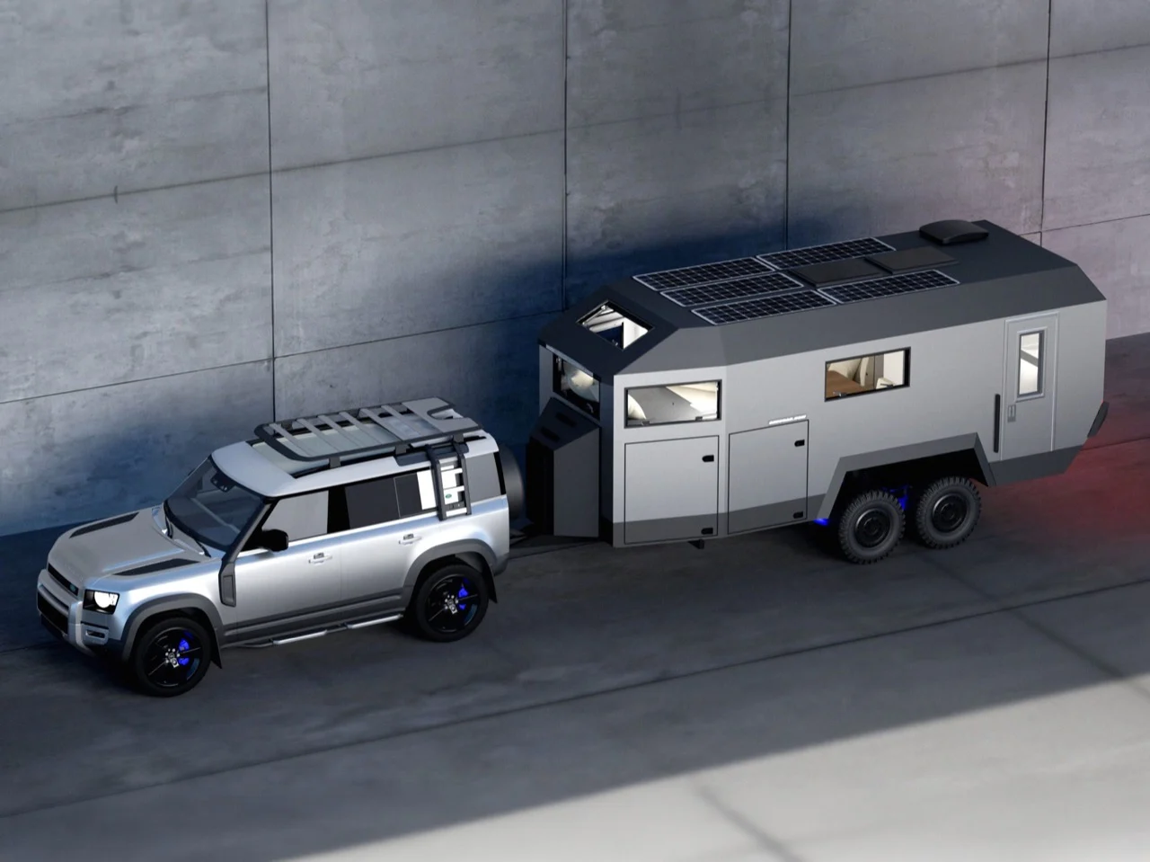Despite their differences, both formats share identical DNA. The same faceted exterior. The same flat roof designed for solar integration. The same sharply cut windows that feel more like apertures in a bunker than traditional RV glazing. Together, they form a cohesive system—modular in application, singular in identity.