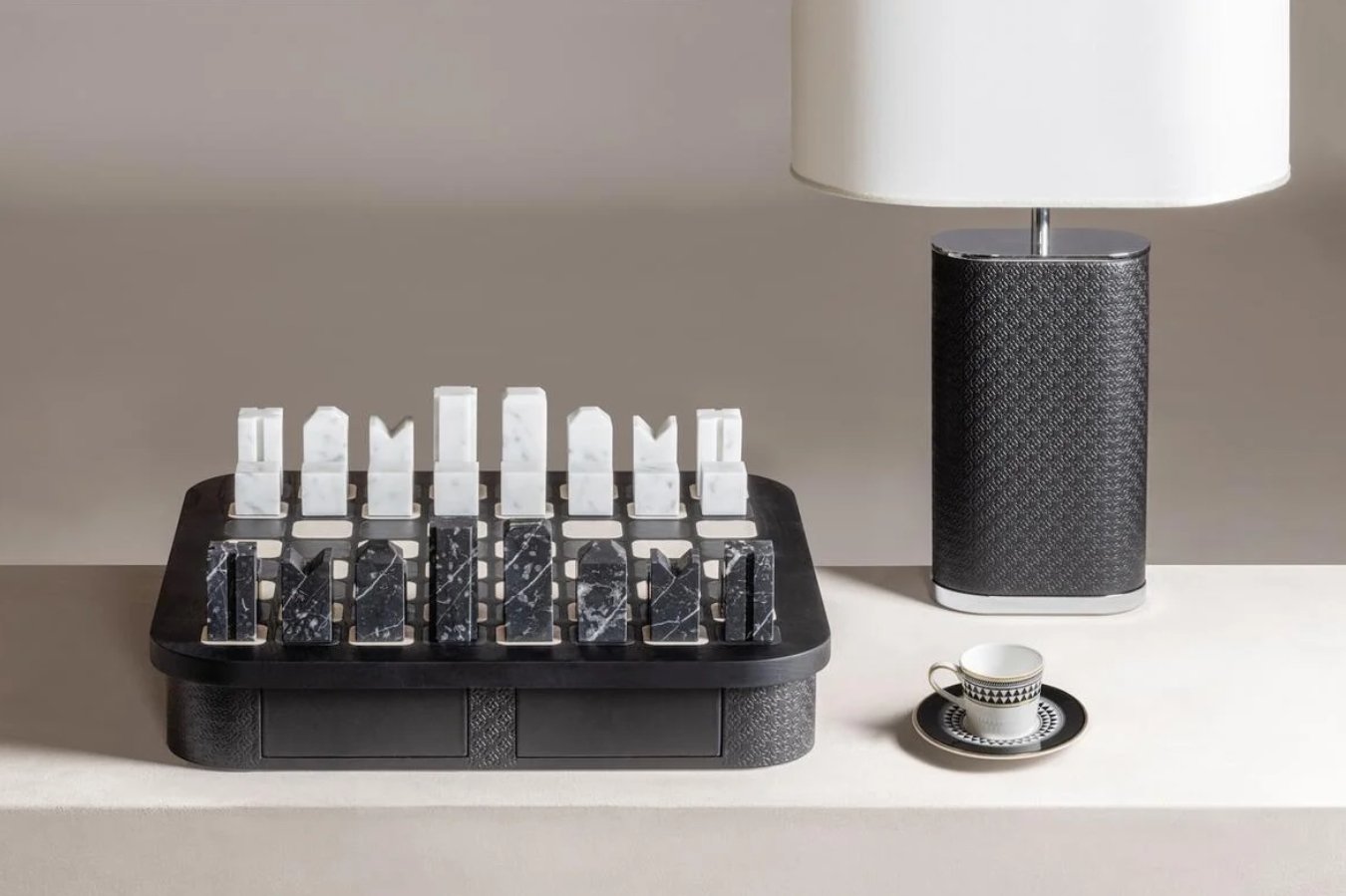 One of the most striking pieces in the collection is the chess set, which features Carrara and Marquina marble playing pieces. The set reflects a blend of tradition and modernity, utilizing materials that have long been associated with elegance and wealth. Carrara marble, with its pure white background and subtle veining, contrasts beautifully with the deep, inky black of Marquina marble. This choice of material elevates the chess set from a mere game to an exquisite object that serves as both entertainment and decoration. Each chess piece is meticulously sculpted, showcasing the level of craftsmanship that Giobagnara is known for, while the overall design channels Elie Saab’s eye for detail and elegance.