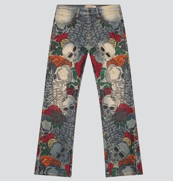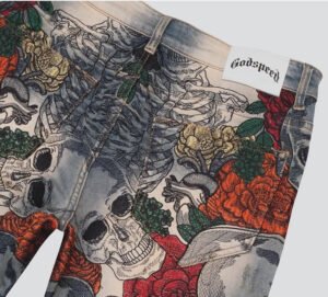 In the ever-evolving lexicon of expressive streetwear, few garments are as visually commanding as the Godspeed Embroidered Skeleton & Floral Denim jeans. These pants are not simply an article of clothing—they are a canvas of contradiction, where themes of mortality and rebirth collide in one intensely detailed wearable.
