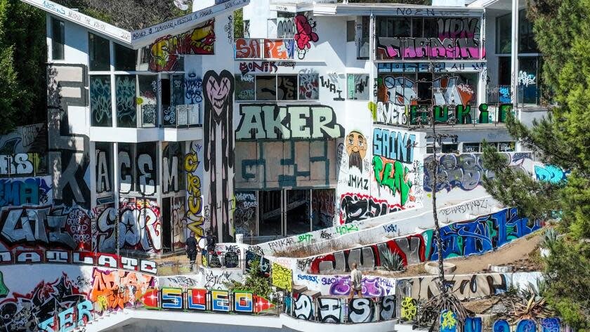 The properties in question, valued at over $100 million combined, were once considered jewels of the Hills, boasting minimalist architecture, manicured lawns, and pristine facades. But now, they’re adorned with massive graffiti murals, crude tags, and politically charged messages scrawled across walls, fences, and even inside empty pools. It’s not your average commissioned street art—these markings, often spontaneous and chaotic, resemble more of a protest against the conformity of wealth and traditional luxury living.
