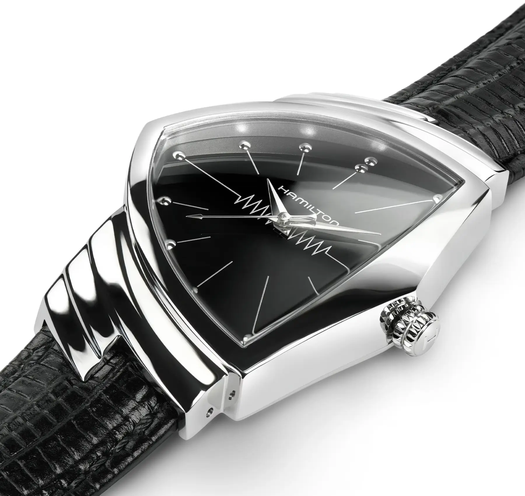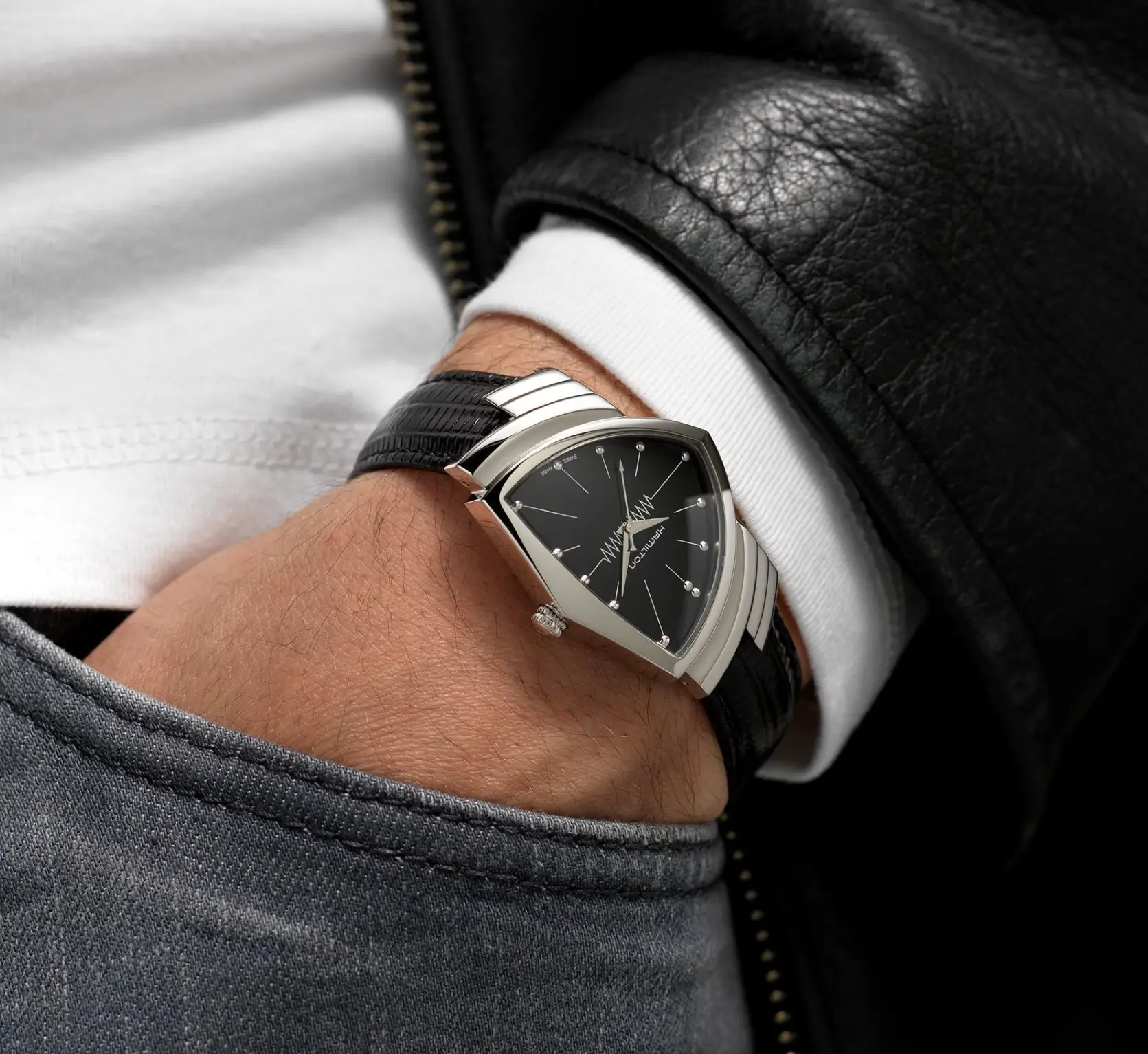 Placed adjacent to the narrative of the Hamilton Khaki Field Murph Auto—a watch defined by emotional storytelling and scientific symbolism—the Ventura reads as its conceptual counterpoint. Where the Murph is circular, legible, and grounded in continuity, the Ventura is angular, electric, and disruptive. Together, they articulate Hamilton’s dual identity: discipline and imagination, function and spectacle.