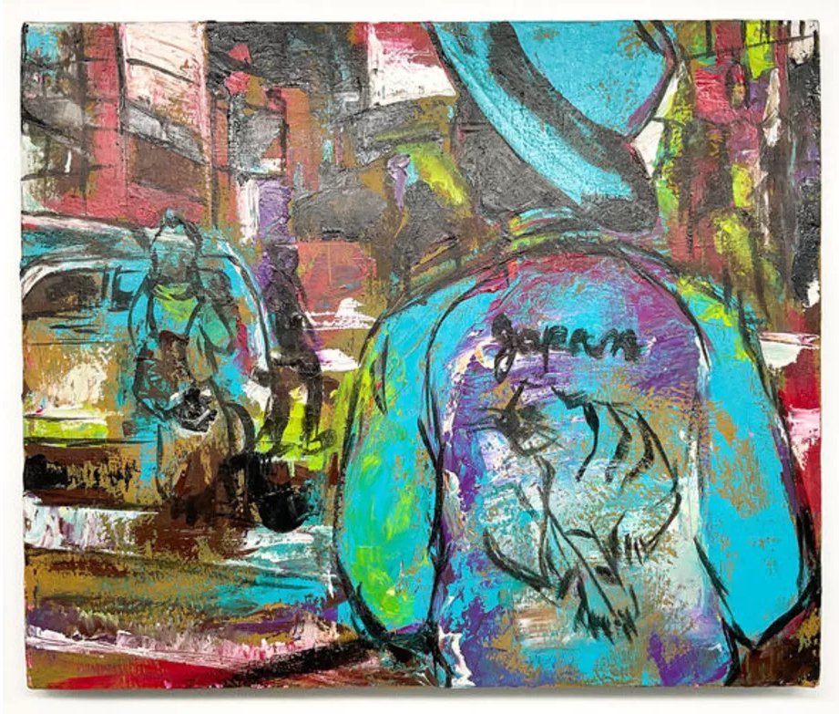Through thick applications of paint, Egawa adds a tactile quality to the artwork. The layers of color and form give the impression of a bustling crowd, with overlapping elements reinforcing the district’s dense, urban environment.