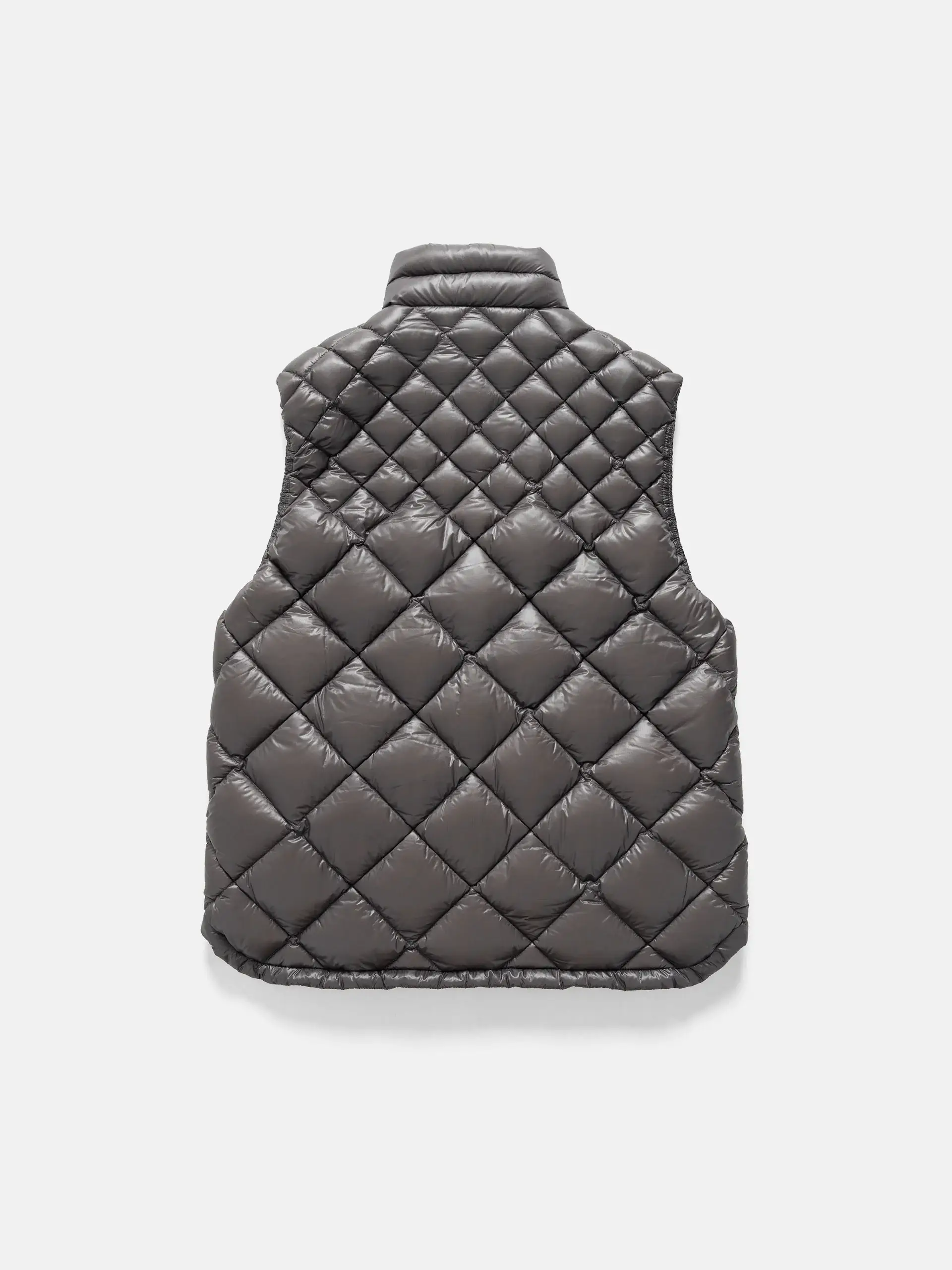 The first impression is defined by the vest’s diamond-quilted patterning, which is not merely an aesthetic flourish. The quilting stabilizes the down clusters, preventing drift and maintaining insulation consistency across the torso. Combined with the slightly lustrous grey nylon shell, the visual result is almost architectural—geometric but softened, structured yet pliant.