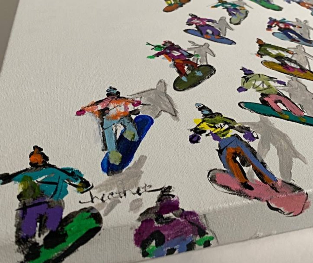 • The layering of paint creates depth, making it feel as though the viewer is immersed in the motion of the snowboarders.