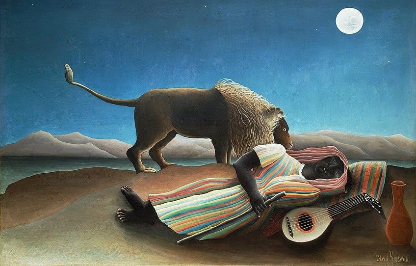 The Sleeping Gypsy has often been interpreted as a visual representation of the dream state. The juxtaposition of the tranquil gypsy and the lion suggests a tension between vulnerability and latent danger, echoing the unpredictable nature of dreams. The surreal quality of the scene aligns Rousseau with later movements like Surrealism, which sought to explore the subconscious mind.