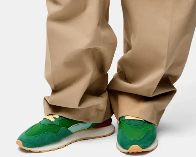 When styled with beige or khaki pants, the green tones become the focal point of the outfit, creating a sophisticated yet relaxed look. The sneaker also pairs well with darker denim, where the bright laces and pastel panels add contrast.