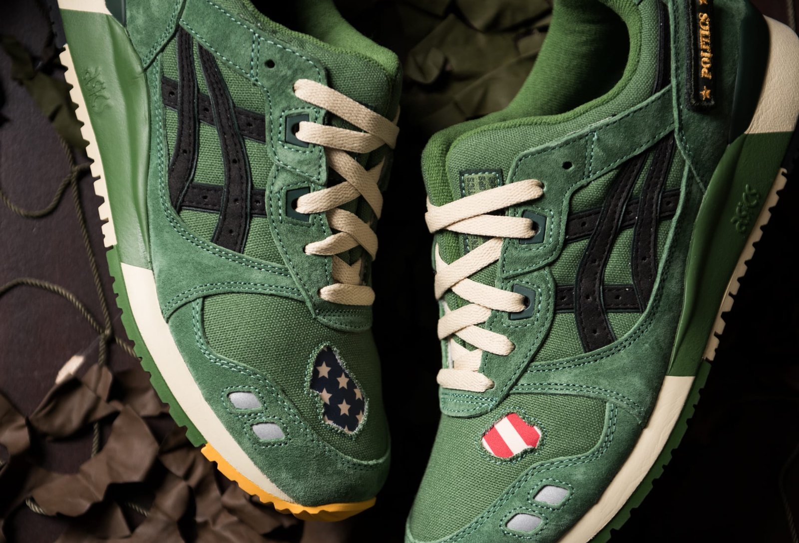 - Military-Inspired Details: Removable badges on the lateral ankle mimic name tapes found on uniforms, with “POLITICS” branding on the left shoe and “GEL-LYTE III” on the right.